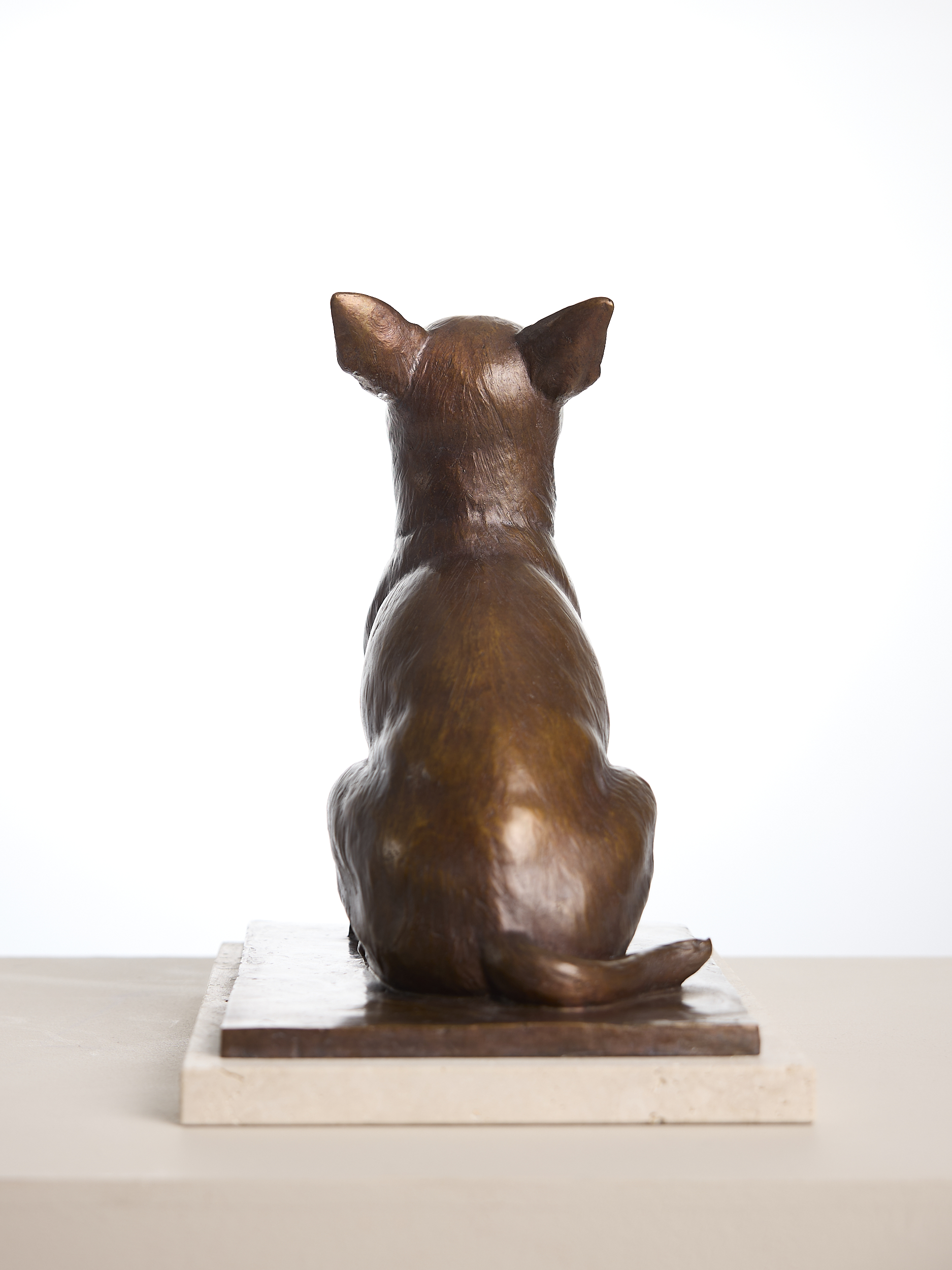 Elegimos el bronce como material protagonista por su nobleza, resistencia y belleza eterna, características que reflejan perfectamente la relación profunda que se establece entre humanos y mascotas. Trabajamos la figura con paciencia y delicadeza, capturando no solo su postura sentada y tranquila, sino también la dulzura de su mirada, la serenidad de su expresión y esa esencia tan particular que su familia reconocería al instante.